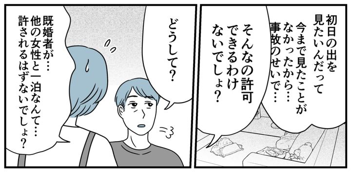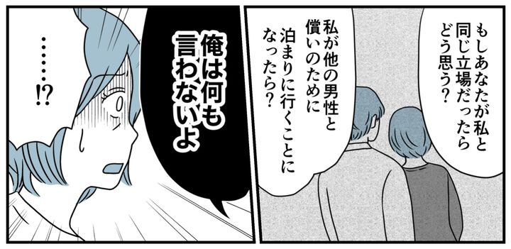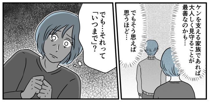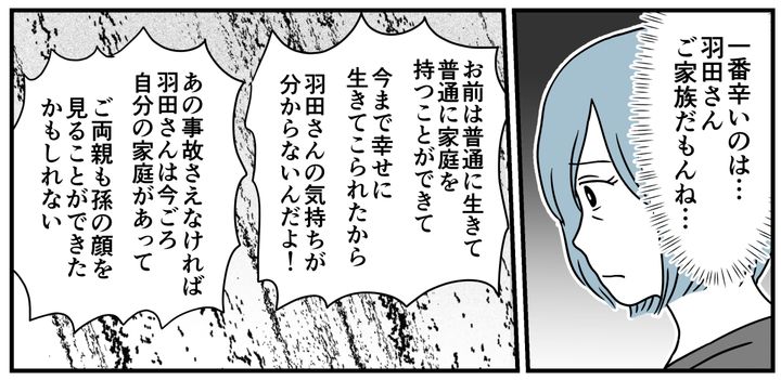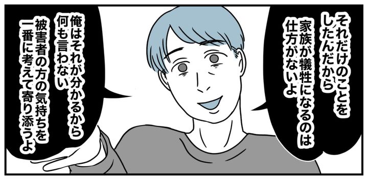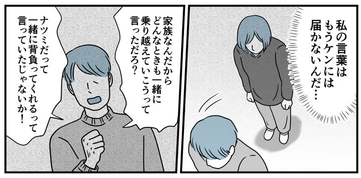 私の言葉はケンに届かなくなっていました。私が何を言っても、ケンは家族の気持ちじゃなく被害者である羽田さんの気持ちが最優先なのです。私だって別に彼女の気持ちがどうでもいいわけではありません。でも羽田さんが家族のペースに入り込んでくることにどうしても納得ができません。ケンが当たり前のように受け入れろと言ってくることには、嫌だという感情しかありませんでした。