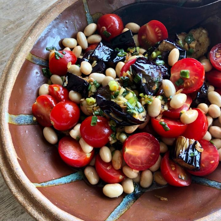 こちらは冷蔵庫に白インゲンがあったので、素揚げした茄子に冷蔵庫にあったミニトマトと薬味を混ぜて、胡麻油に醤油や砂糖など王道のおいしい組み合わせで和えて、いただきました。
