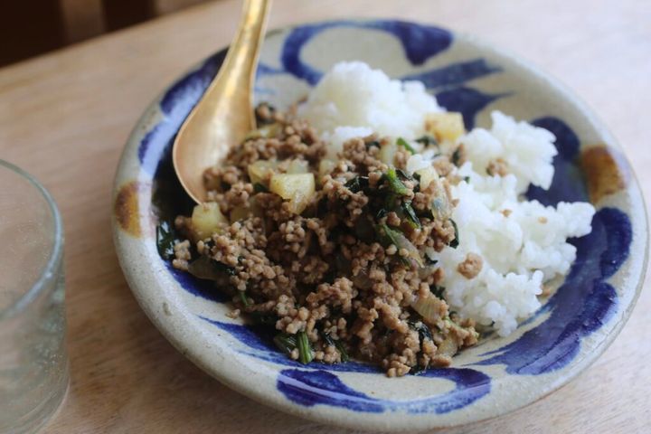 豚ひき肉にほうれん草や玉ねぎ、じゃがいもをオイスターソースとナンプラーで炒めた料理は、茶色ベースで(よくありますよね。赤の食材を足せばよかったという時!)だったので、本当にいいアクセントになってくれました。