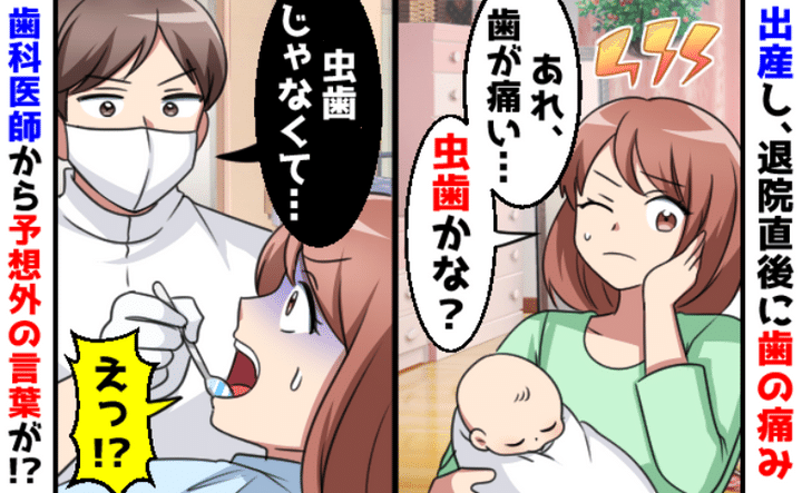 私は里帰りで2人目を出産。母子ともに健康で順調に退院へと至りました。しかし、退院直後に「あれ、歯が痛い……」と感じた私。あまり気にしないようにしていましたが、それから数日後、とうとう痛み止めを飲まなくてはいけないほどに。実家の近所にある歯科医院へ駆け込むと、医師が言いました。「虫歯じゃないね……」と。