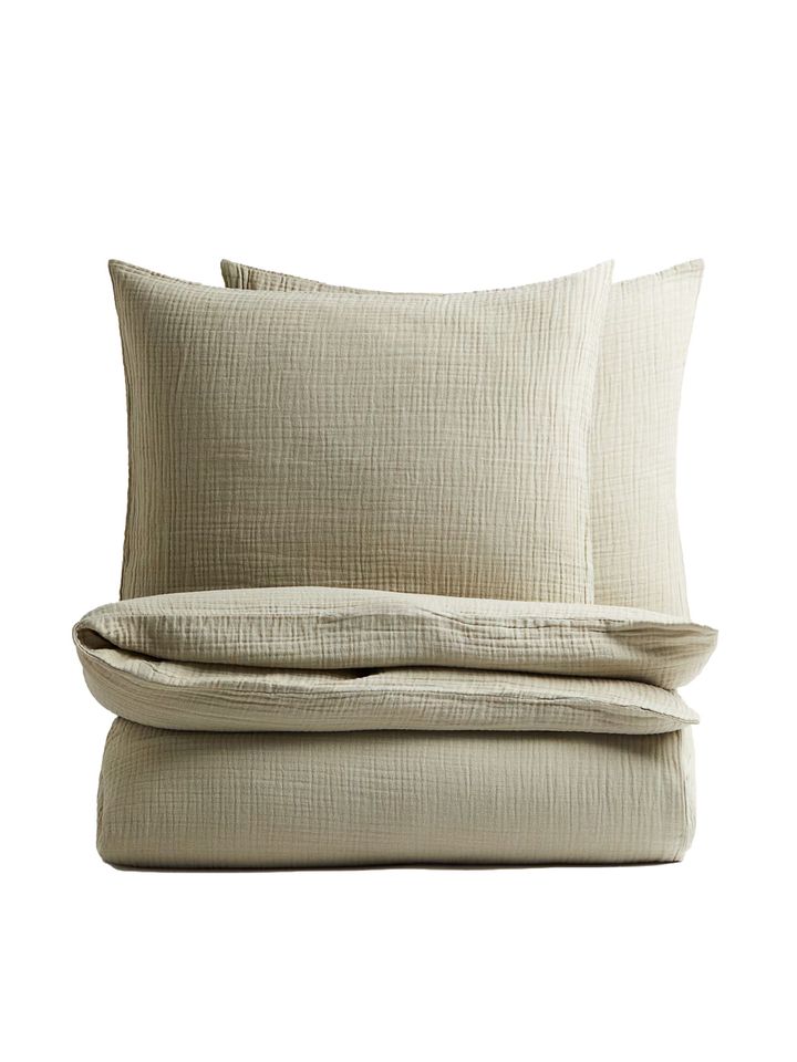 心地よい睡眠へと誘ってくれる、ダブルサイズの掛け布団カバー&ピローカバーセット。コットンモスリン素材は薄手で空気をよく通し、蒸れにくいのが特徴。やわらかな手触りで、心地よい睡眠へと誘ってくれる。淡いカラーはインテリアにもすんなりと馴染み、取り入れやすい。