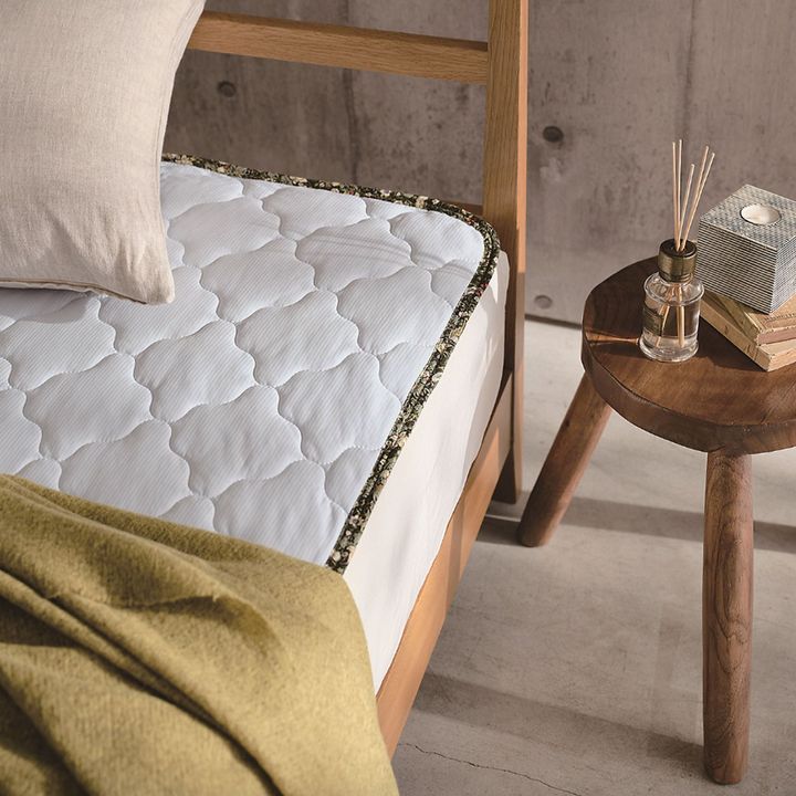 敏感肌にとって、全身に長く触れ続けるベッドリネンは慎重にセレクトしたい。表面はもちろん、中綿や裏地までオーガニックコットンを使用した敷きパッドは刺激が少なく、汗ばむ夏でも安心して使用できる。無添加・無漂白と隅々までこだわり抜いた逸品だ。