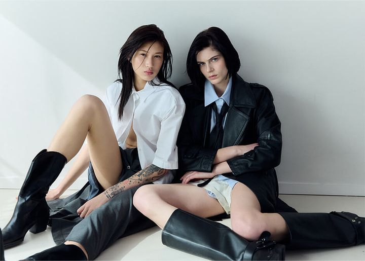 from left - shirt by THE FRANKIE SHOP, shoes by ALYSI, tie by HUGO BOSS,shirt by HELMUT LANG, skirt by THE ROW, shoes by VAGABOND, jacket and shorts by THE FRANKIE SHOP