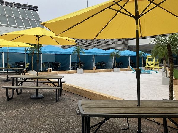 コンセプトは「地域の方々に愛されるビアガーデン」×「非日常の集える駅前リゾート」。新ビアガーデンの最大の特徴は、約150㎡にわたる真っ白な砂浜が広がる「ホワイトビーチ」で、旧そごう川口店時代の屋上ビアガーデンの“手軽さ”と“集いやすさ”は継承しつつ、リゾート空間のような「非日常感」がプラスされました。