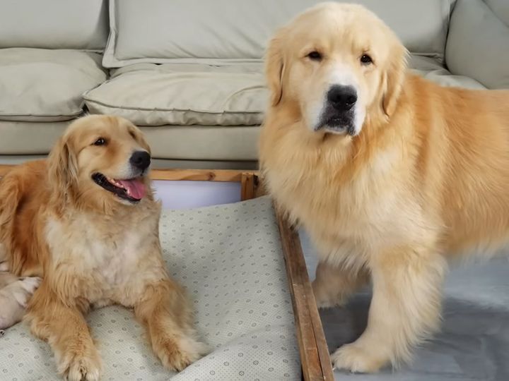 子犬もいっしょに家族で眠れると思ったパパ犬、ママの反応にシュンとなる瞬間