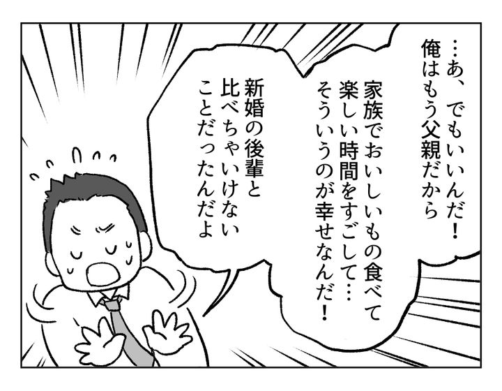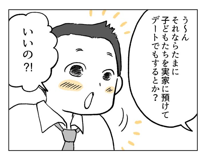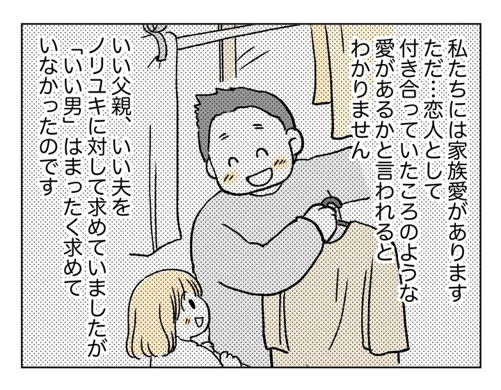リオナさんはノリユキさんの要望を叶えてあげようと「2人だけのデート」を提案しました。一瞬喜ぶノリユキさんですが、立場はもう父親。結婚したばかりの後輩とはわけが違うことを思い出し、お弁当の件も自分が間違っていたと謝罪しました。その様子を見てリオナさん、何やら考えているようです。