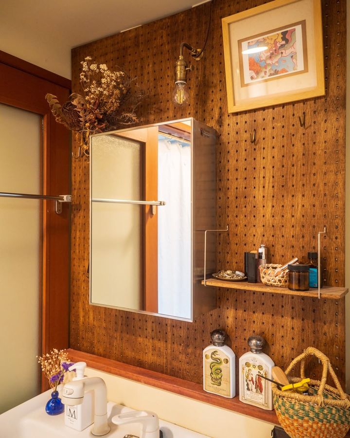 洗面台にも同じように有孔ボードを取り付けて、さらに開くと棚になっているミラーボックスを設置して収納力をアップ。