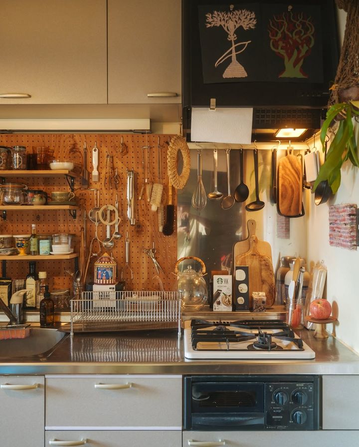 キッチンにはアジャスターの柱を使って、有孔ボードを取り付け、引っ掛ける収納ができるように。