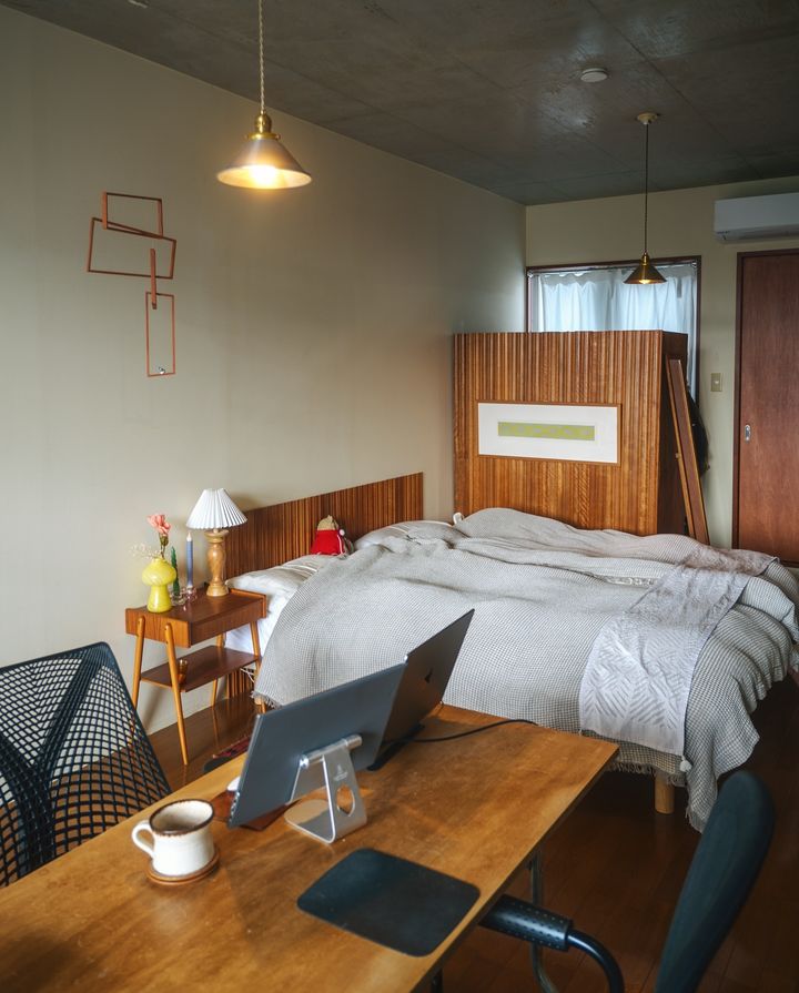 こちらは寝室兼お二人のワークスペースとして使われている、上階の10畳のベッドルーム。デザイナーズ物件ならではの悩み、収納不足については、おーえさんはDIYで収納を増やすことで対応をされています。