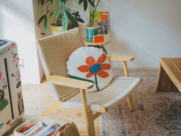 チェアとセットで置かれているのが住まいの象徴と話す MIYOSHI RUG のお花クッション。