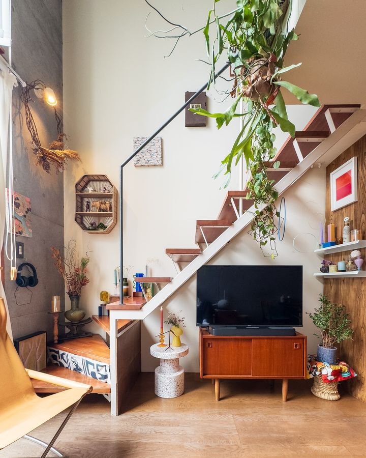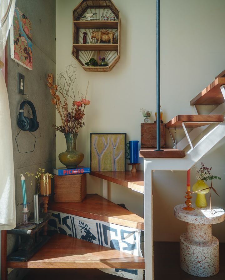 特にお気に入りという、たくさんのものが飾られた、ソファ正面の階段スペース。訪れたお店や蚤の市、旅行先など、さまざまな場所から好きなものが集まってきているそう。