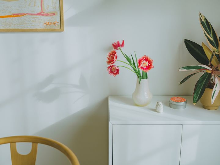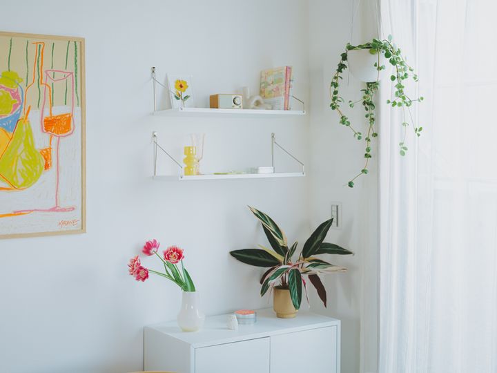 白ベースの空間に、雑貨やお花の色合いもより映えますね。ディスプレイスペース1つで空間の印象も簡単に変えやすいのも良いところ。