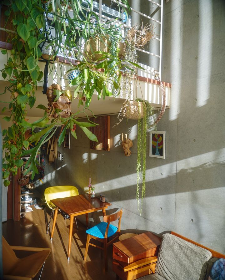 大小様々な植物が住まいの各所に置かれていて、空間全体に緑が広がっている様子が印象的でした。