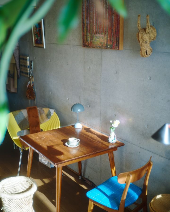 特にお気に入りは、真ん中に飾られた不思議なラインのようなものが描かれたもの。蚤の市で手に入れたもので、じつはアート作品ではなく、川の地形を学ぶための小学校の教材なんだそう。そんなストーリーも含めて、ワクワクするものでいっぱいの空間です。