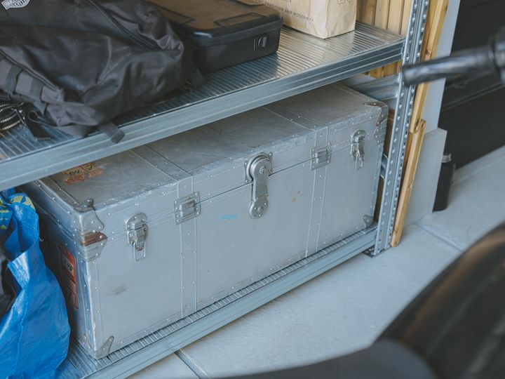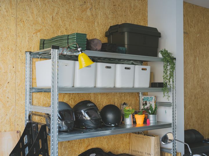 多趣味なkinokoさんのガレージ収納は、シェルフと収納アイテムで綺麗に整理整頓。