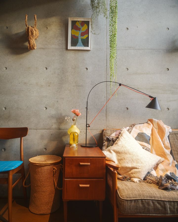 メゾネットで、天井が高く抜け感があるところ、コンクリート打ちっぱなしの内装などが気に入って選ばれたというお部屋。