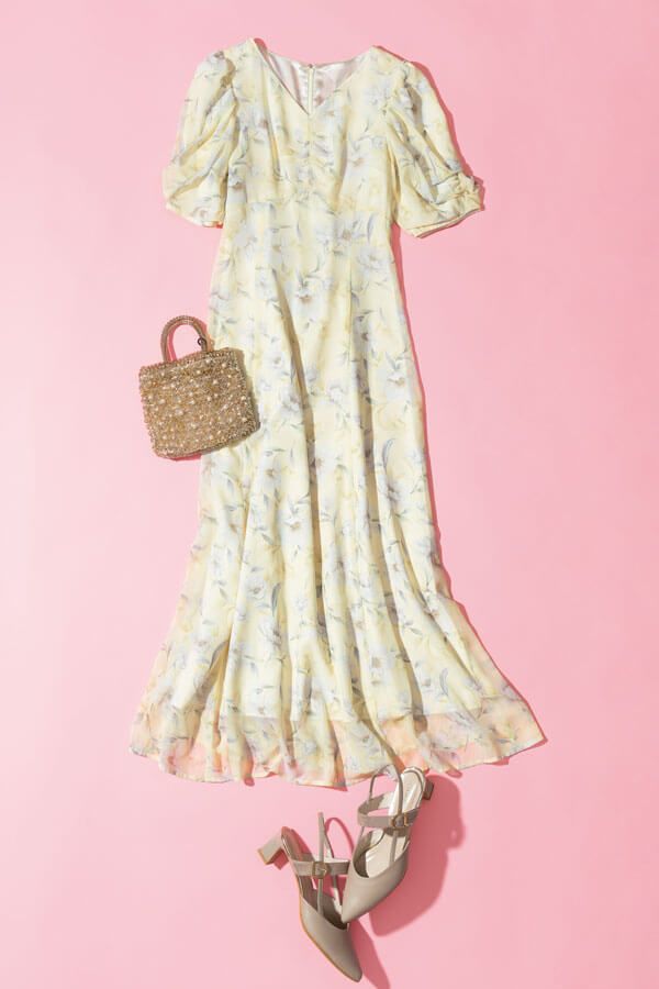 イエローにのせた線画調の花柄が大人フェミニン。胸元のギャザーや切り替えで女性らしいシルエットを強化。