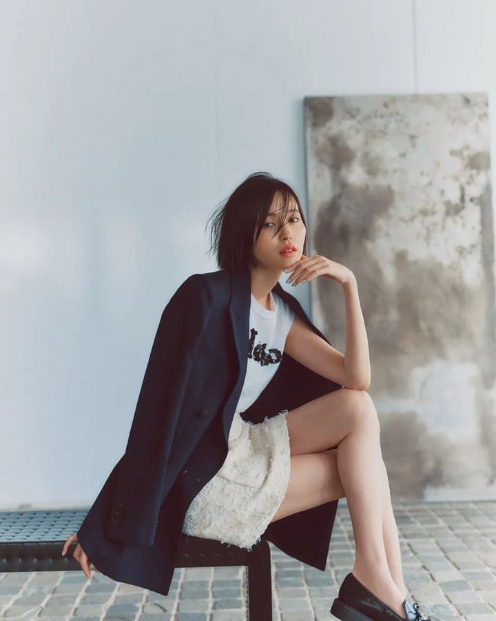 第3位は同率で2つ。ひとつはTシャツ×テーラードジャケットというミューズらしい定番アイテムを使ったマディソンブルーの大人カジュアル。ベーシックなアイテム同士の組み合わせも、スパンコールがあしらわれたTシャツやツイードのミニスカートなど、存在感のある素材をきかせることで華やかな着こなしに。「マネしたい」というコメントも多数見られました。