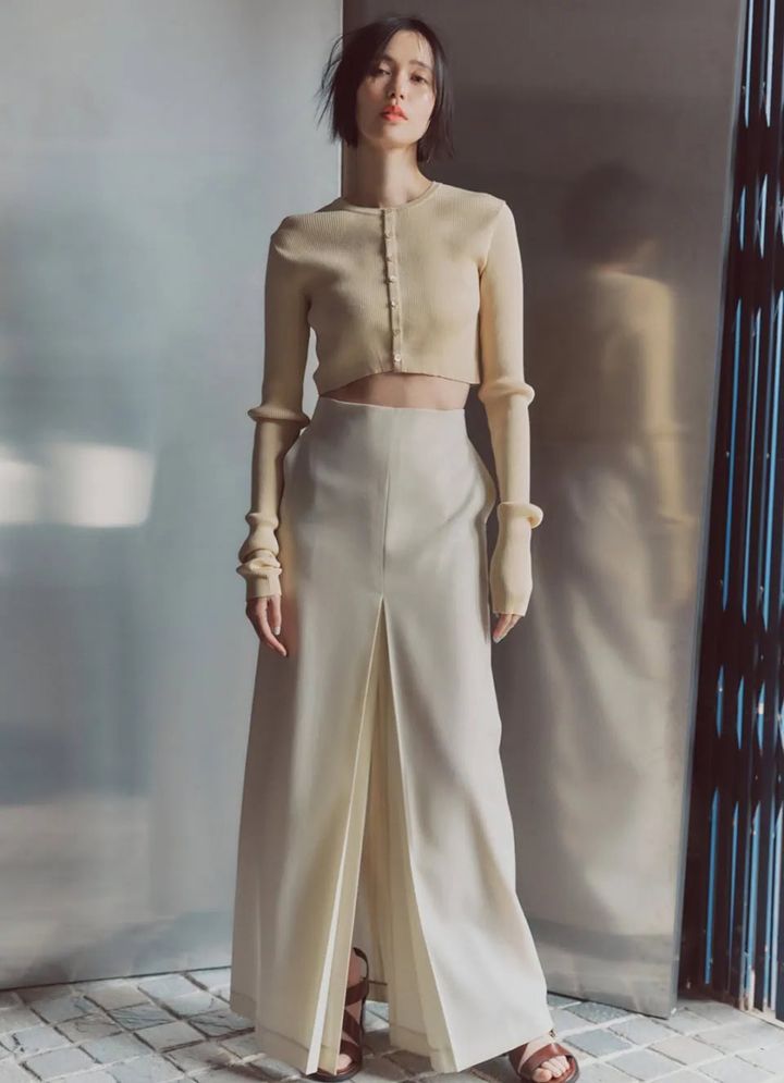 同率第3位のもうひとつは、好きなブランドとして常に上位に名前が上がる、オーラリーのコーディネート。オーラリーらしいニュアンスイエローにエクリュカラーのスカートと、トーンオントーンの着こなしが柔らかなでクリーンな印象。それでいてぼんやりせず洗練された印象に決まるのは、美しいシルエットと肌見せのメリハリにあり。ルーズなヘアスタイルとのバランスも◎。