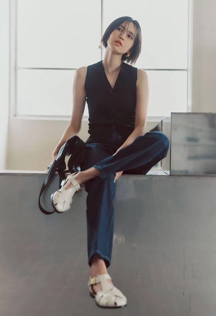 第5位は鉄板の人気ブランドを紹介した「“なんかいい”が詰まってるミューズなブランドLIST」より、ロエフのコーディネートがランクイン。ベスト×デニムという一見ハンサムなコーデも、ベストを素肌に着ることでグッと女性らしいムードに。全体的にダークな色合わせを軽やかに見せるホワイトのグルカサンダル、華やかさをプラスするゴールドのピアスもポイント。