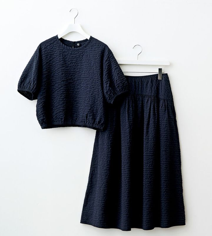 3. 【ユニクロで指名買い】50代が選ぶべき1着「シアサッカーブラウス/半袖シアサッカーボリュームスカート」単品でもセットアップでも大活躍