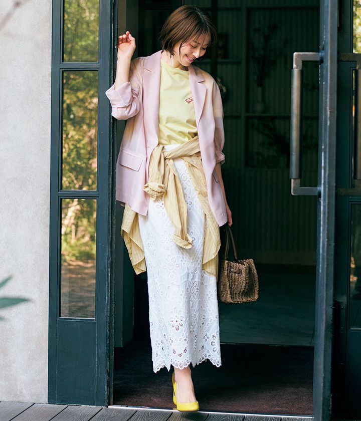 ジャケット¥23,100スカート¥25,960(ともにフレイ アイディー/フレイ アイディー ルミネ新宿2店)Tシャツ¥13,200シャツ¥26,400(ともにシンゾーン/シンゾーン 表参道本店)バッグ¥15,400(ミラ オーウェン/ミラ オーウェン ルミネ新宿2店)パンプス¥69,300(ペリーコ/アマン)