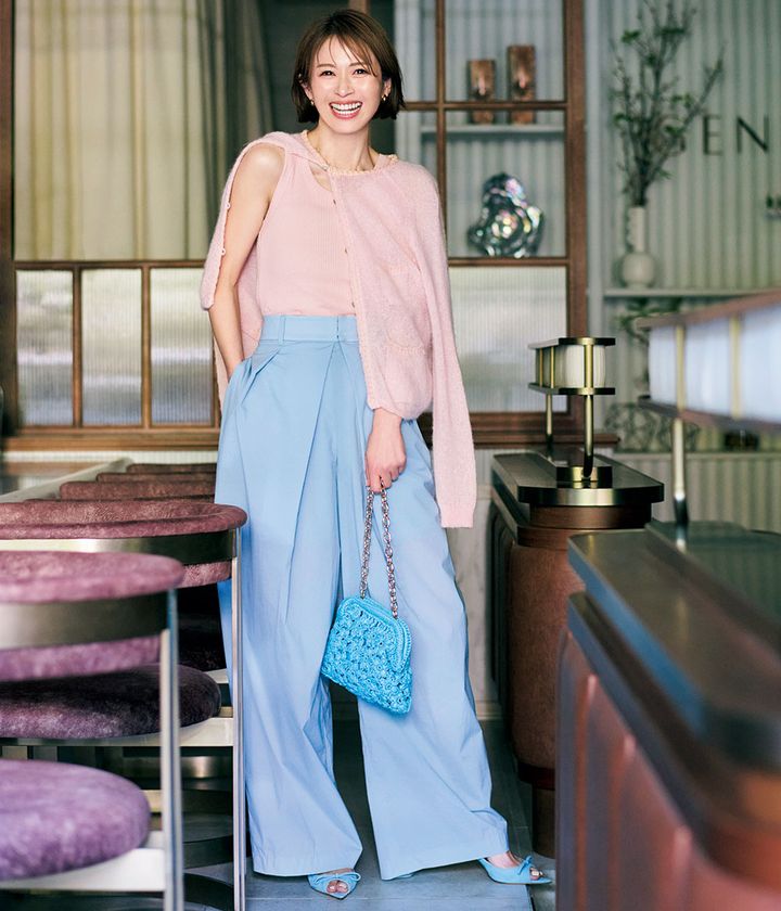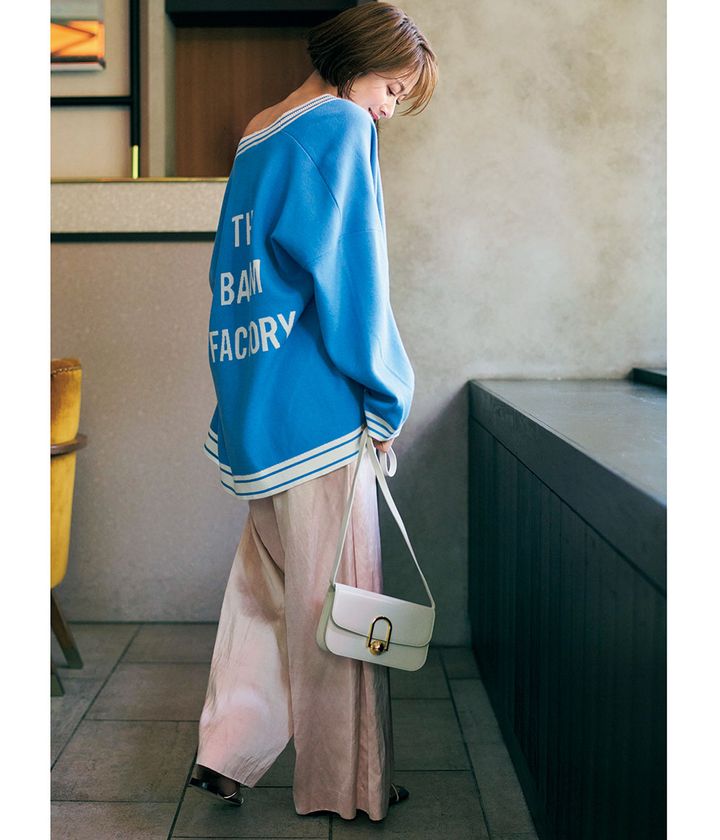 ブルー×ピンクはルーズに着崩してヘルシーな女っぽさを。ドレッシーな印象のワイドな艶パンツをビッグカーデでカジュアルダウンして。