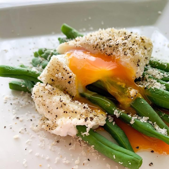 こちらはアスパラのポーチドエッグのせをいんげんで再現。