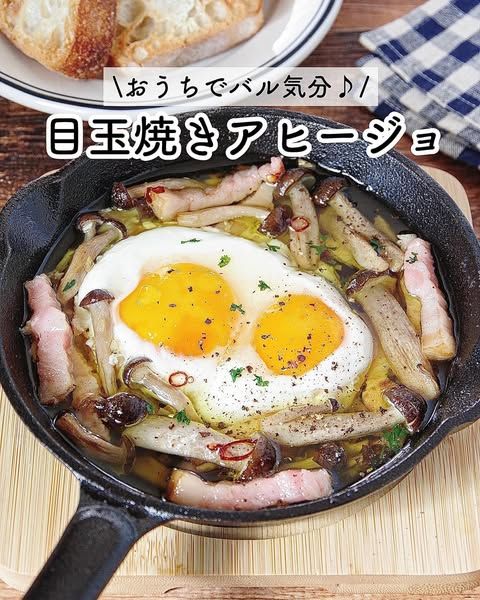 スキレットにオリーブオイル、唐辛子、にんにくを入れて熱し、ブロックベーコンとしめじを入れて加熱し味を調えます。最後に卵を割り入れて半熟になったら完成。