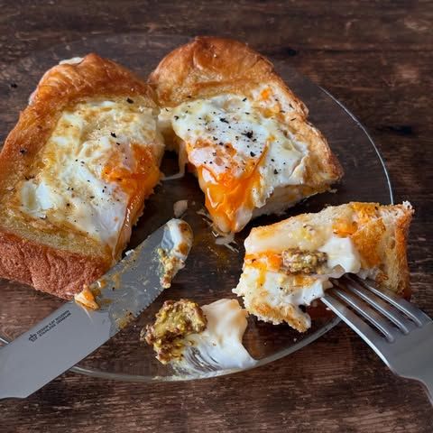 フライパンに油をしいてカリッと焼き上げたトーストの真ん中には、とろりとした半熟の目玉焼きと、同じくとろりとのびるチーズ。