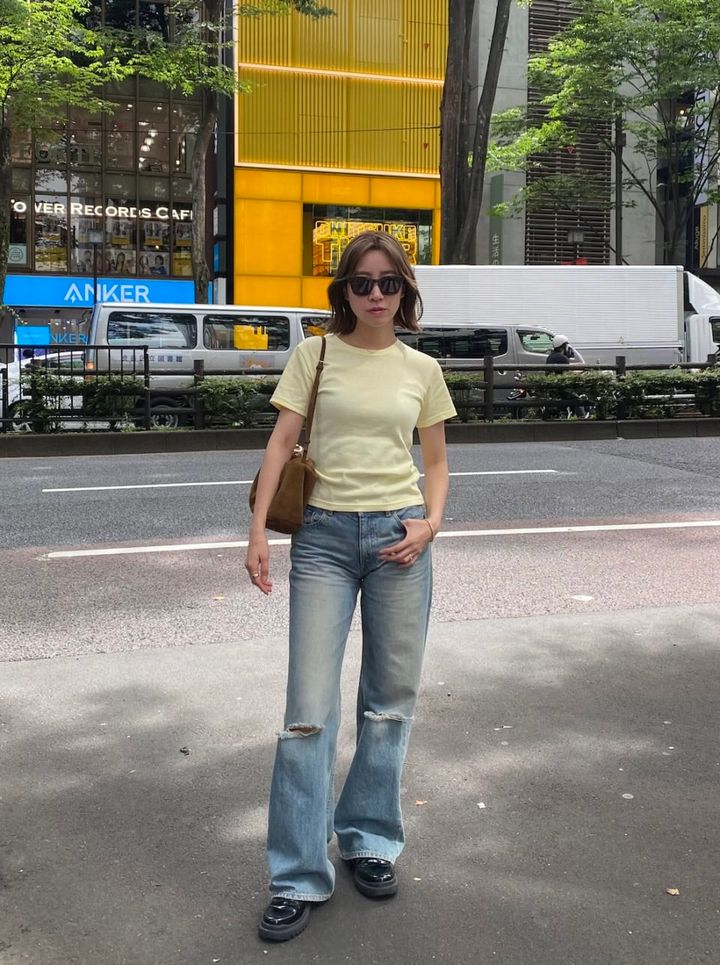 「ヴィンテージライクなイエローベースのダメージデニムに、顔まわりがパッと明るくなるレモンカラーのTシャツをコーディネートしました。ボトムがルーズな分、トップスをコンパクトにまとめてバランスを取っています」