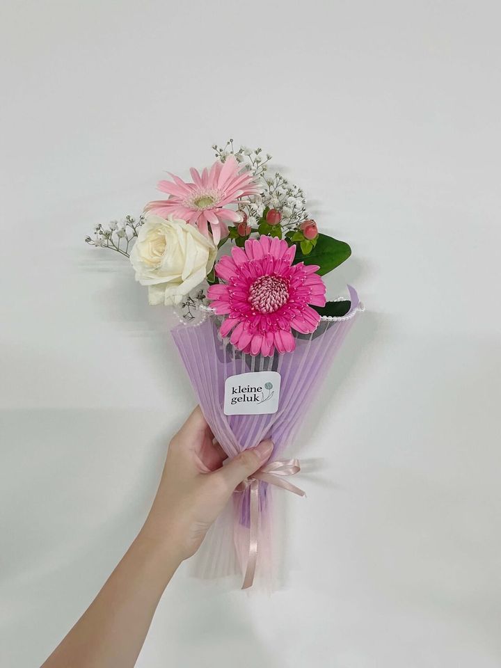 2種類のピンクのガーベラや白のバラなど、全部で5本のお花を選びました。