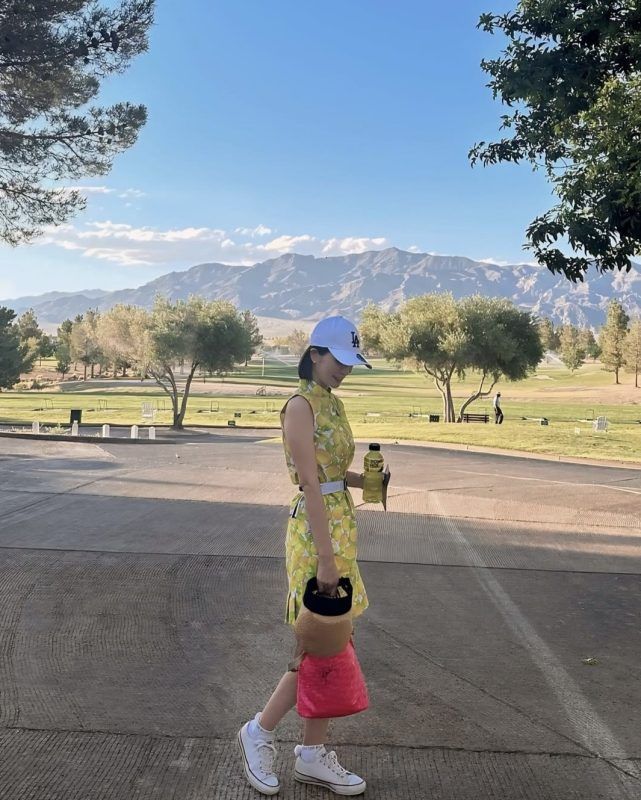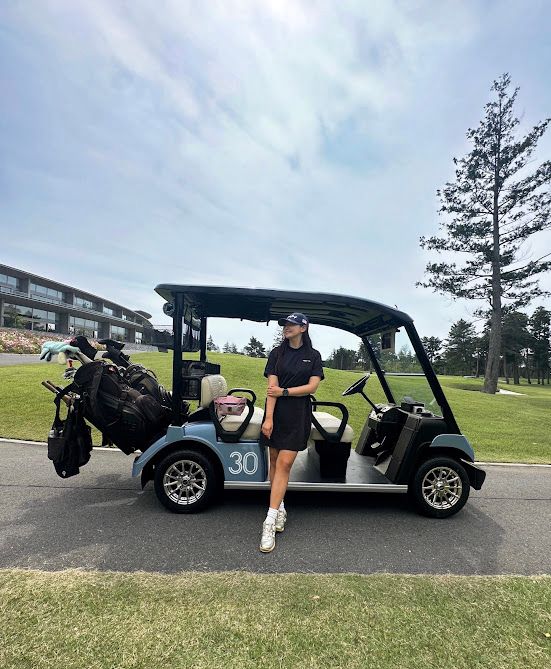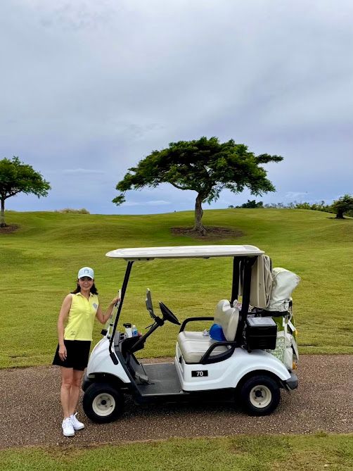 上記の写真は真夏のグアムで夫とラウンドでの一枚。2人でリゾートぽい色&柄のZOYのウェアーで揃えました。どうせ日焼けしてしまうならと、潔くノースリーブ&スカート見えする短パンのゴルフコーデでリゾート気分を満喫。その代わり日焼け止めを頻繁に塗り直しました。靴下焼けもしたくないので靴下はくるぶし丈で。頭皮と髪の日焼け防止には、見た目の可愛さよりも日焼け予防優先でツバが長めのキャップがマスト。汗をかくので服の着替えも持参 します。