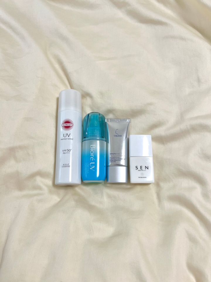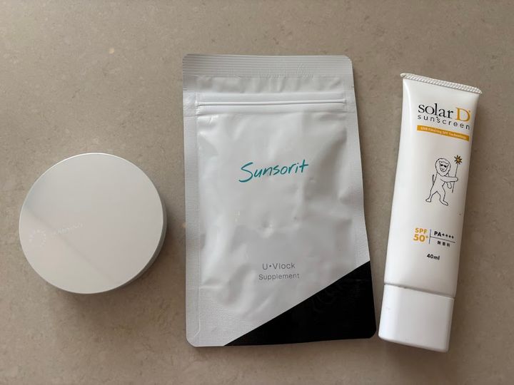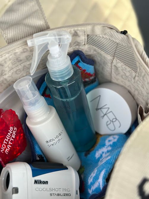 飲む日焼け止めのヘリオケアが手放せません。また、SPF42/PA++のクッションファンデや暑さ逃しのスプレーなど、汗をかいた時に水のいらないシャンプーなど持参します。