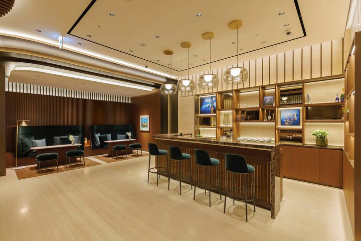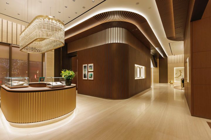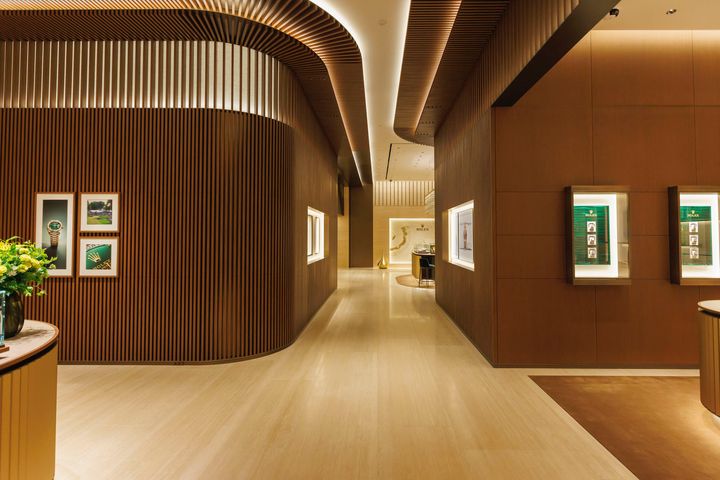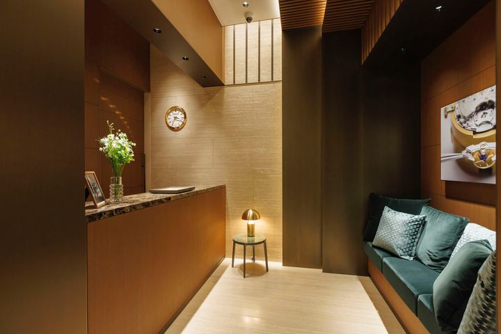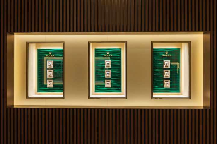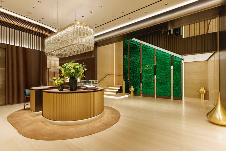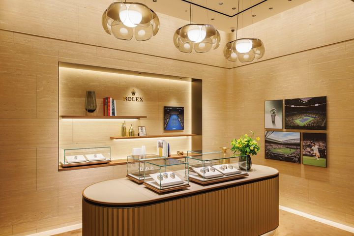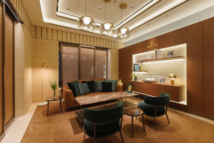 扉を開けて店内へ。高級感のあるトラバーチンのベージュと、ダークブラウンのウォルナットの木目使いのコントラストが美しく、明るく落ち着いた雰囲気。ロレックスの時計の特徴のひとつであるジュビリーブレスレットから着想を得たというシャンデリアや、ダイアルの日付部分を拡大するサイクロップレンズがモチーフとなったライトのシェード、そしてフルーテッドベゼルを模した側面のデザインが印象的なカウンターなど、随所にロレックスの大切な要素が反映されたインテリアが目を惹きます。