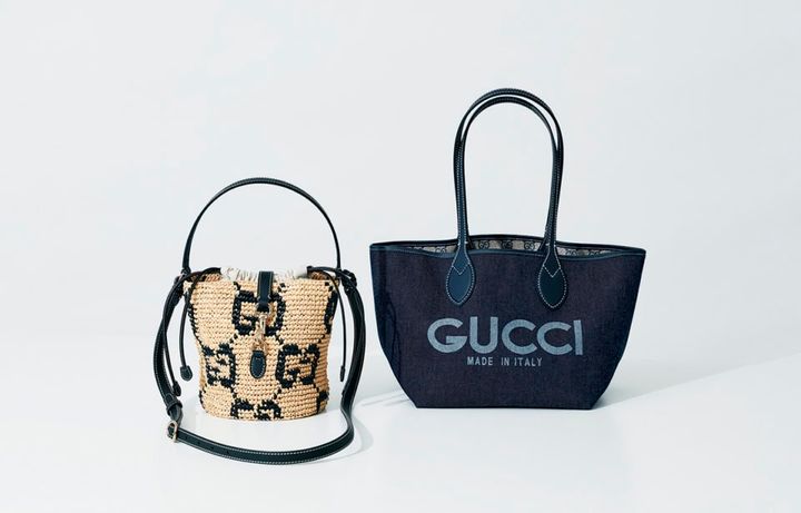 デニム地のGUCCIロゴのトートはGGパターンとのリバーシブルで、通勤やママバッグにも使い勝手のよさそうな軽量仕上げ。ラフィア素材のミニバッグも柔らかな質感で、気負わずデイリーに使えるバッグたちです。