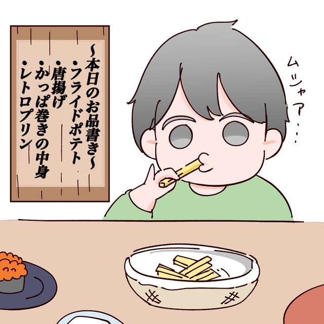 3. 「おしゅしおいしかった」と幸せそうな息子だが、食べたのはポテトと唐揚げです|和栗家の日々