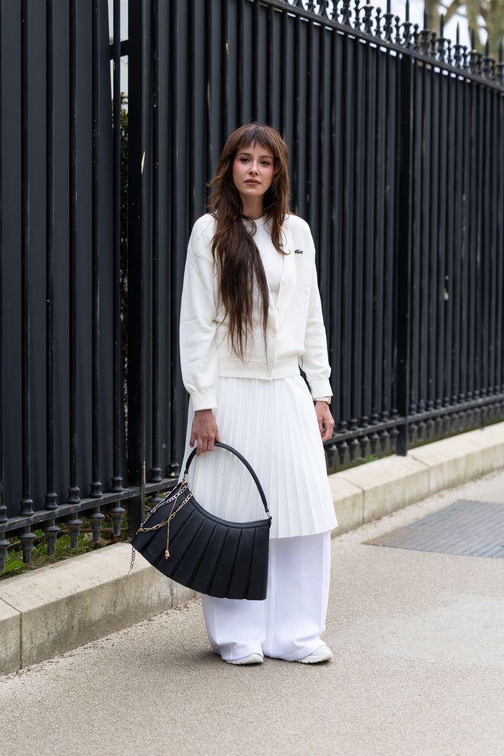 ホワイトのワイドパンツとスニーカーは、ミディ丈スカートをレイヤードすればガラッと異なる印象に。ストリートライクなコーデでよく見られるスタイリングだが、オールホワイトなら、きちんと感とエッジィさを両立できる。