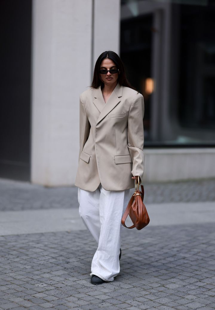 カジュアルな印象の強いワイドパンツには、やや大きめシルエットのベージュのテイラードジャケットをなじませれば、オフィスディナーにもぴったりな自然でモダンなスタイルが叶う。写真のルックのように、スニーカーやサングラスはブラックをチョイスして、スタイリッシュに引き締めて。