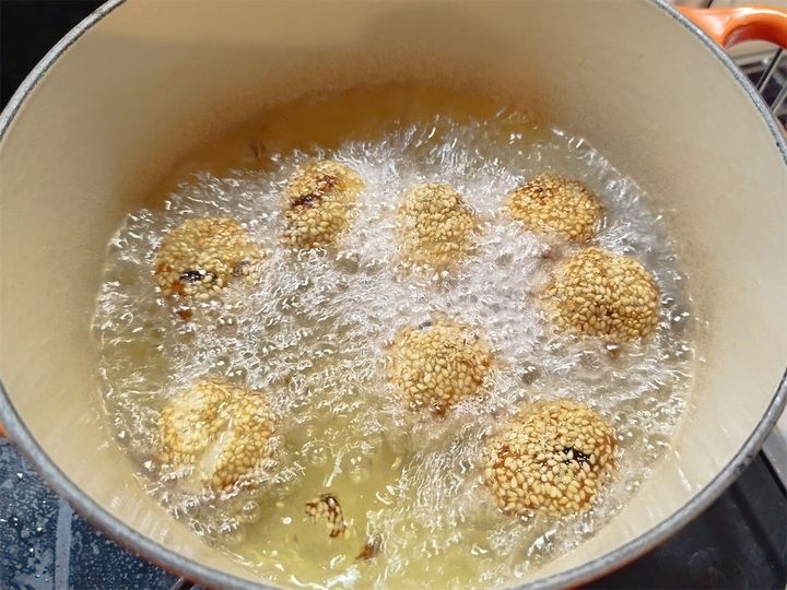 油は、ゴマ団子の頭が少し出るくらいの量を入れたのですが、少し鍋の底にくっついてしまったので、完全に浸かるくらいまで入れた方がよいかもしれません。