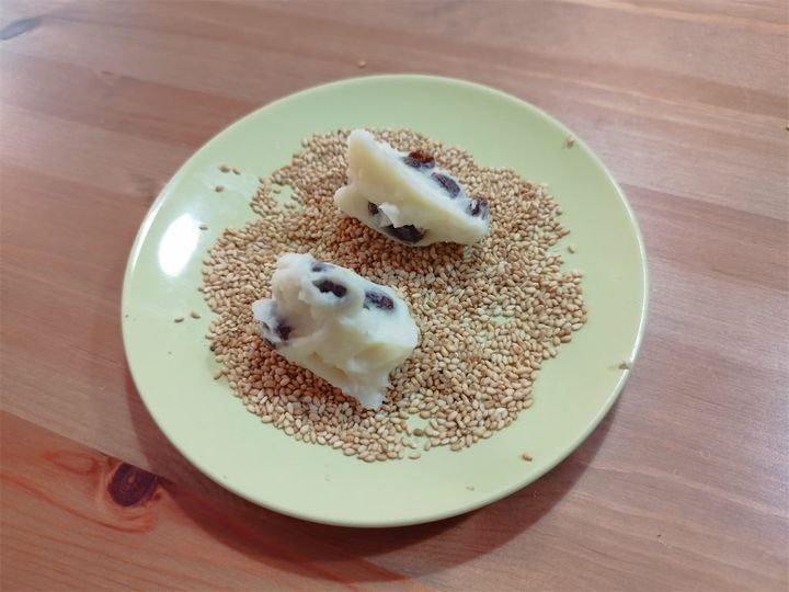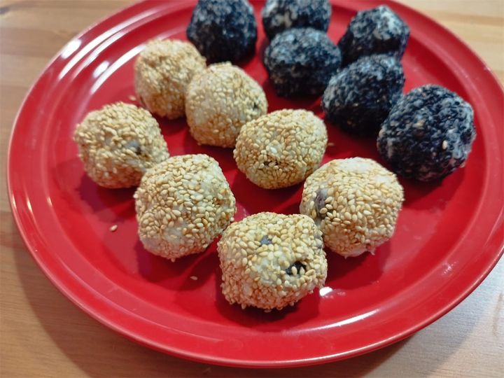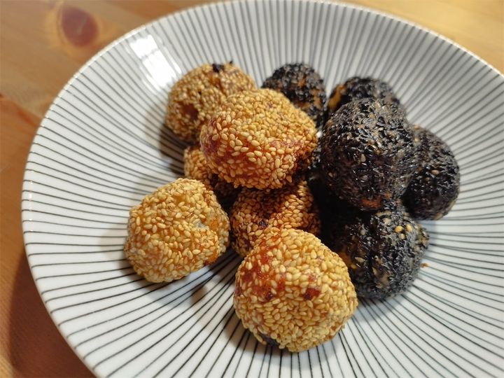 レシピでは、生地を丸めてから表面に軽く水気を付け、白ゴマ、黒ゴマをそれぞれまぶすとのことですが…