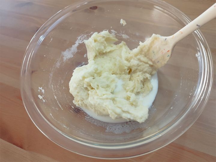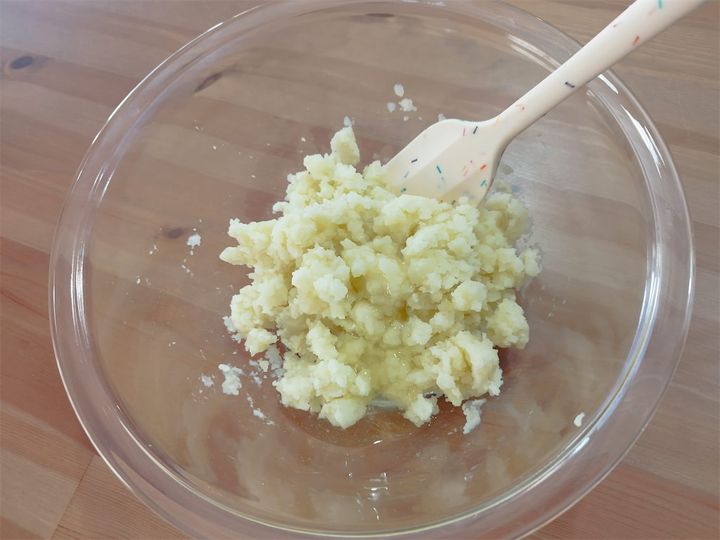 3. 2の潰したじゃがいもに卵白を入れ、シリコンベラでよく混ぜる。