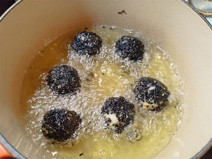 6. 白ゴマver.、黒ゴマver.の順に油で2分ほど揚げる。