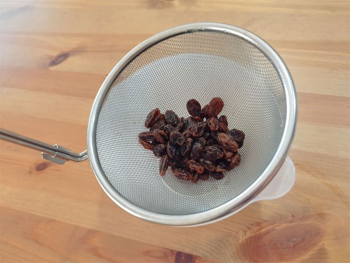 時間が経ったら、ザルにあげます。こうすることで、レーズンが柔らかくなるんですって。