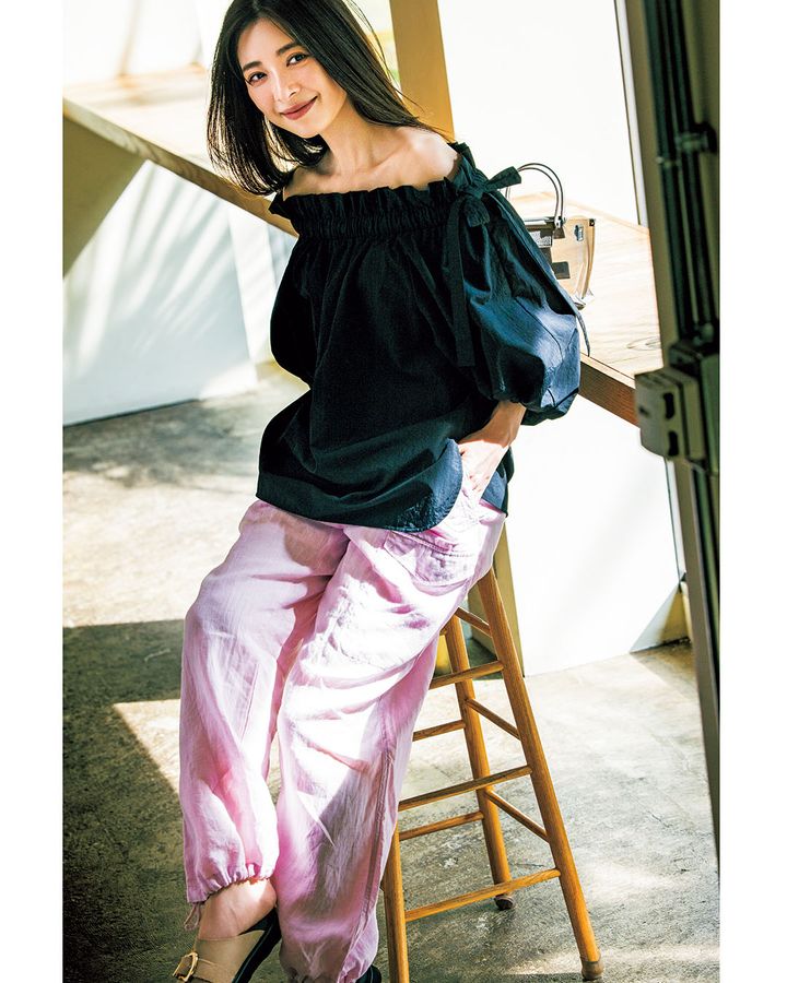 ブラウス¥24,200(アンクレイヴ/アンクレイヴ〈オンワード樫山〉)パンツ¥26,400(ティッカ)シューズ¥22,880※オンラインストア限定販売(モヒ/ルタロン 有楽町マルイ店)バッグ/スタイリスト私物