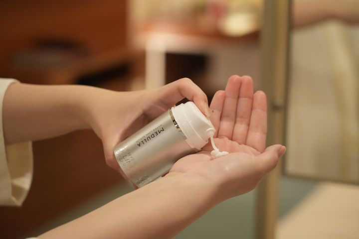 ①シャンプー後、タオルドライした髪に適量(ショート1〜2プッシュ、ミディアム2〜3プッシュ、ロング3〜4プッシュ)を手に取り、手のひら全体に広げます。