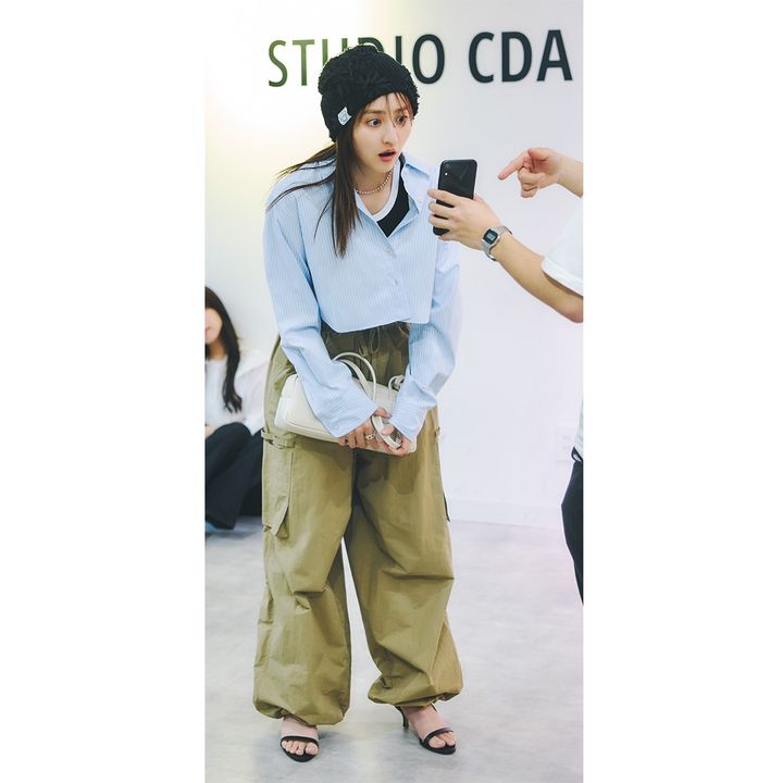 3.ロゴタンクトップ¥9,300(Rest & Recreation/ユー バイ スピック&スパン ルミネ池袋店)ストライプシャツセットアップ シャツ¥14,300(Mardi Mercredi/マルディメクルディジャパン)バッグ¥14,915(STAND OIL/MUSINSA JAPAN)靴¥66,000(ネブローニ)帽子¥12,980(POESIEDAME/SHOWROOM CHRMR)ネックレス¥4,950(Ungrid)リング¥18,700(ラ・スール)ベージュカーゴパンツ着回し