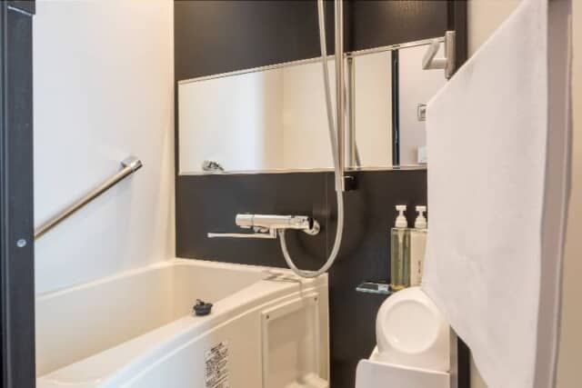 洗い場付きのバスルームにはバスチェアーが置かれ、座って洗えるのも高ポイント。シャンプー類は日本の素材だけで作られたポーラの「 IUGEN(イウゲン)」でした。