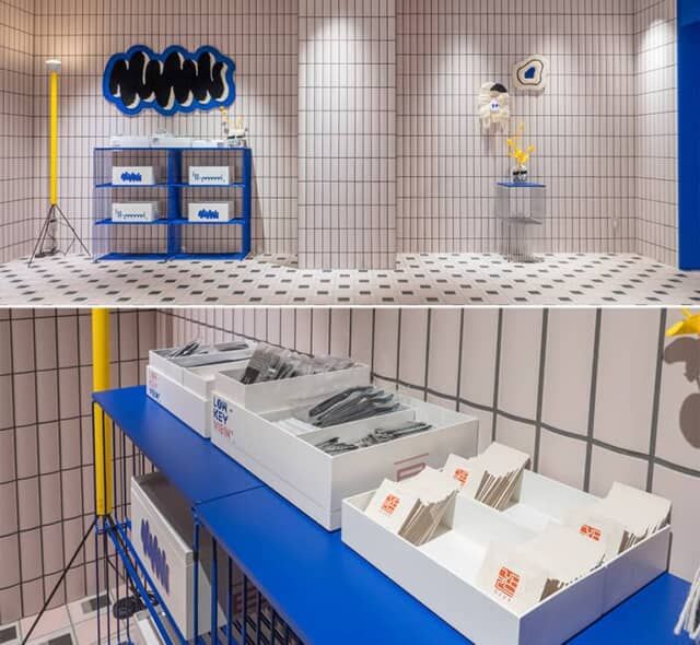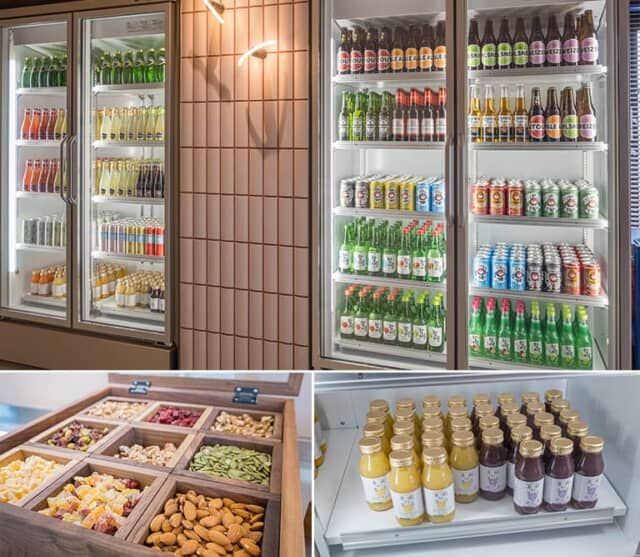 つい写真に撮りたくなる可愛いらしさがさまざまな場所で見つかります。グリッドが連鎖する床のタイルもスタイリッシュ。ロビーの壁にはめ込まれたオフホワイトのタイルが、色鮮やかなアメニティーバーを際立たせ、自然に目を引くデザインが秀逸。客室にはアメニティを置いていないので、必要なものはここでピックアップします。