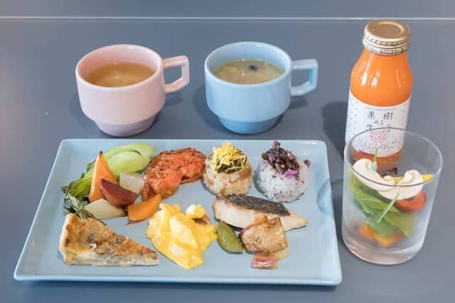 味が際立つキッシュやグリル野菜、映えるおにぎりなど、彩り豊かな料理が並び、テンションが上る朝食です。ジュースやグラスに入ったサラダなどは冷蔵ケースに並んでいるので、好きなものを好きなだけピックアップ。うれしい気分で迎えられる朝食です。
